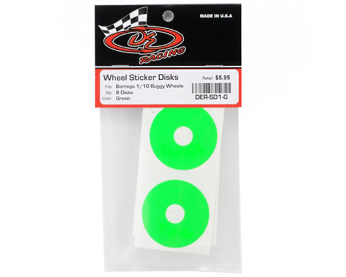 This is a pack of eight DE Racing Fluorescent Green 1/10 Buggy Wheel Sticker Disks. Simply named Wheel Sticker Disks, this ‘Old School’ concept has been brought back to life to further set your car apart from the crowd. Developed for the DE “Borrego” line of 1/10 and 1/8 scale buggy wheels, these precut high quality vinyl stickers create a two-tone effect, highlighting the wheel’s unique bead lock ring. Whether it’s the high tech appearance of carbon fiber, the high visibility of fluorescent colors, or simply ‘mud plug’ matte black, these disks are sure to turn some heads.