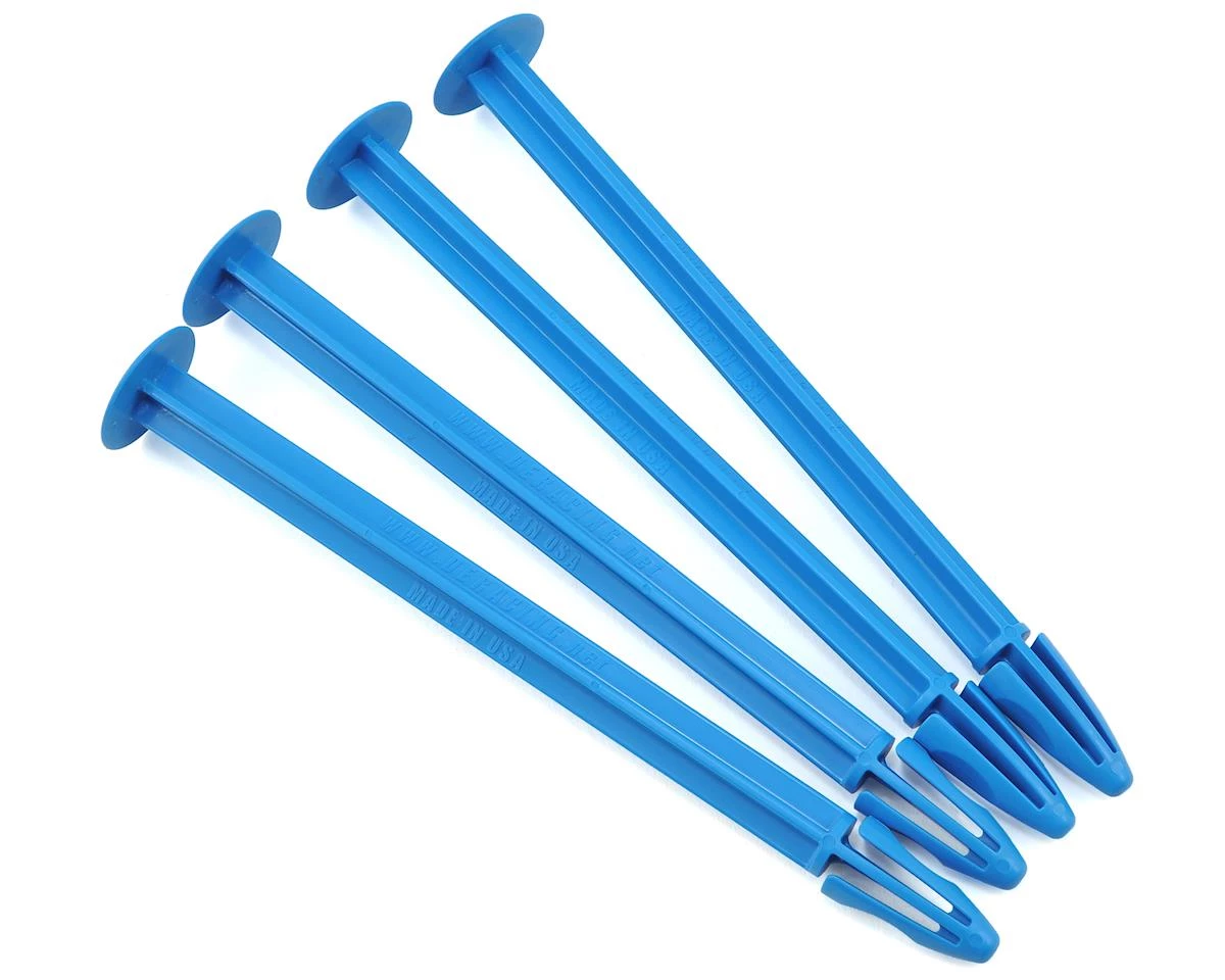 This is a set of four DE Racing 1/8 Buggy Tire Spikes. This quick and simple to use tool allows you to organize and ID your tires by tread and compound. No more fumbling or guesswork regarding tire sets, lost tires, or extra hardware. You’ll wonder how you ever raced without them.