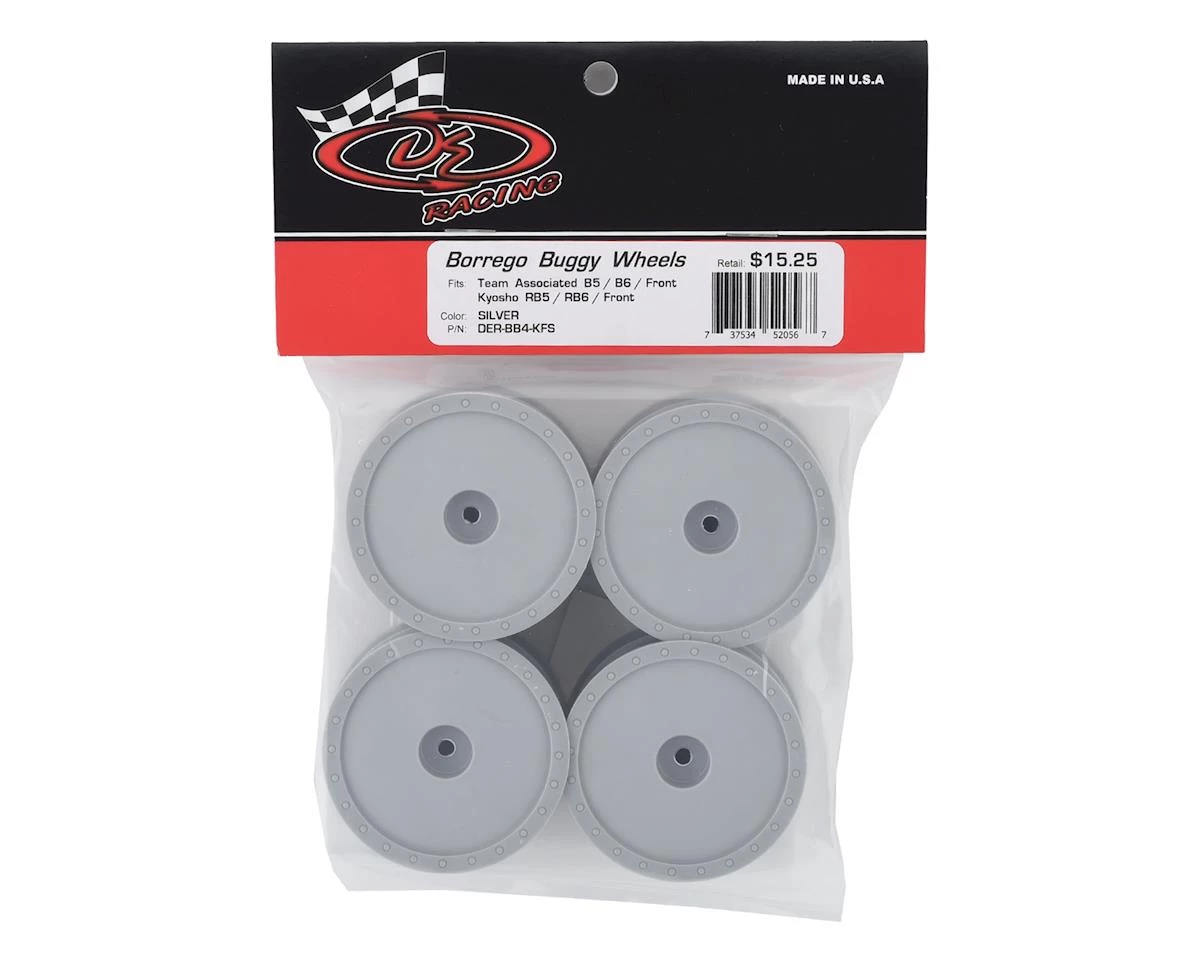 This is a set of four DE Racing “Borrego” 2.2 1/10 Buggy Front Wheels, and are intended for use with the Kyosho RB6 and Associated B6 family of 1/10 buggies. Born from the grueling demands of the Baja 1000 and forged by the wheel to wheel action of Crandon, DE Racing brings the RC world the “Borrego” buggy wheel. Constructed to satisfy the most discriminating racer while offering scale realism that has never before been available for 1/10 buggies, the “Borrego” wheel is sure to be a new favorite for many drivers.