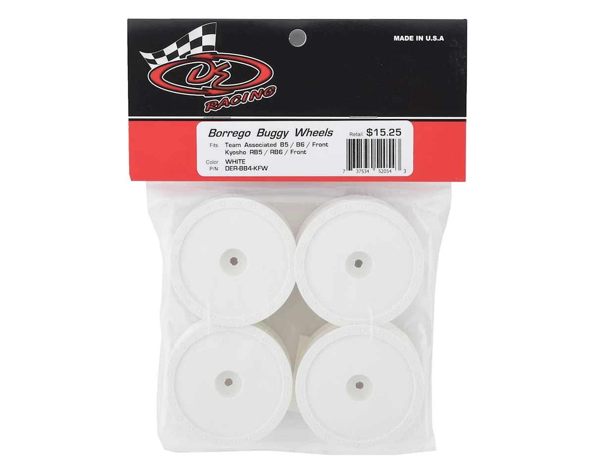 This is a set of four DE Racing “Borrego” 2.2 1/10 Buggy Front Wheels, and are intended for use with the Kyosho RB6 and Associated B6 family of 1/10 buggies. Born from the grueling demands of the Baja 1000 and forged by the wheel to wheel action of Crandon, DE Racing brings the RC world the “Borrego” buggy wheel. Constructed to satisfy the most discriminating racer while offering scale realism that has never before been available for 1/10 buggies, the “Borrego” wheel is sure to be a new favorite for many drivers.