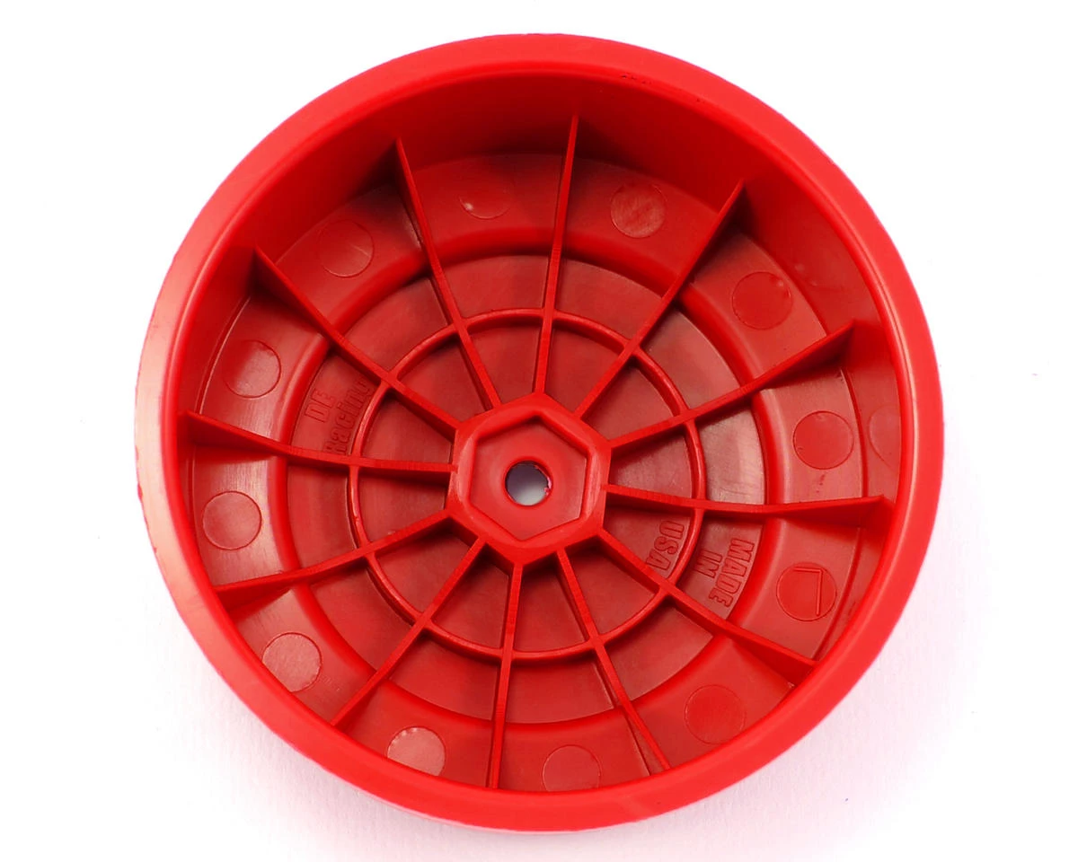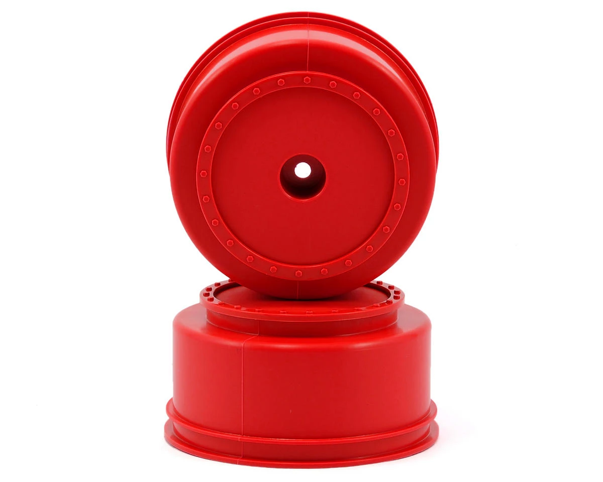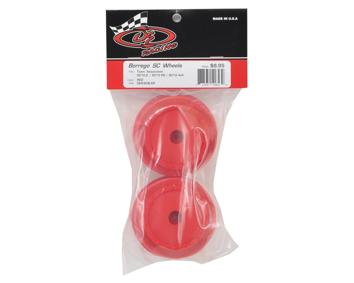 This is a pack of two red DE Racing +3mm “Borrego” SC Wheels, and are intended for use with the Associated SC10 4×4 short course truck, as well as the SC10 when equipped with a 12mm hex conversion. DE Racing has developed the first true dish wheel for the Short Course market. Modeled after the 1/10 buggy line, DE’s “Borrego” wheels feature the realistic scale appearance of a beadlock wheel with mud cover.