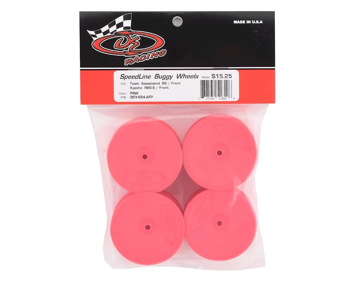This is a pack of four DE Racing “Speedline” 2.2 1/10 Buggy Front Wheels. Blending a traditional style dish wheel to the precision and durability DE Racing is known for, the Speedline series wheels make a statement to the racing community even larger than the logo on the face. Features include a channel for easier tire gluing, start holes for optional venting, and improved wheel flex to optimize traction and handling.