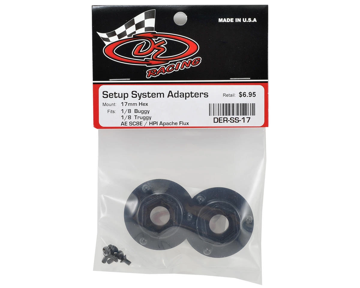 This is a pack of two DE Racing 17mm Hex Adapters, and are intended for use with the DE Racing Setup System. Package includes adapters and necessary hardware.