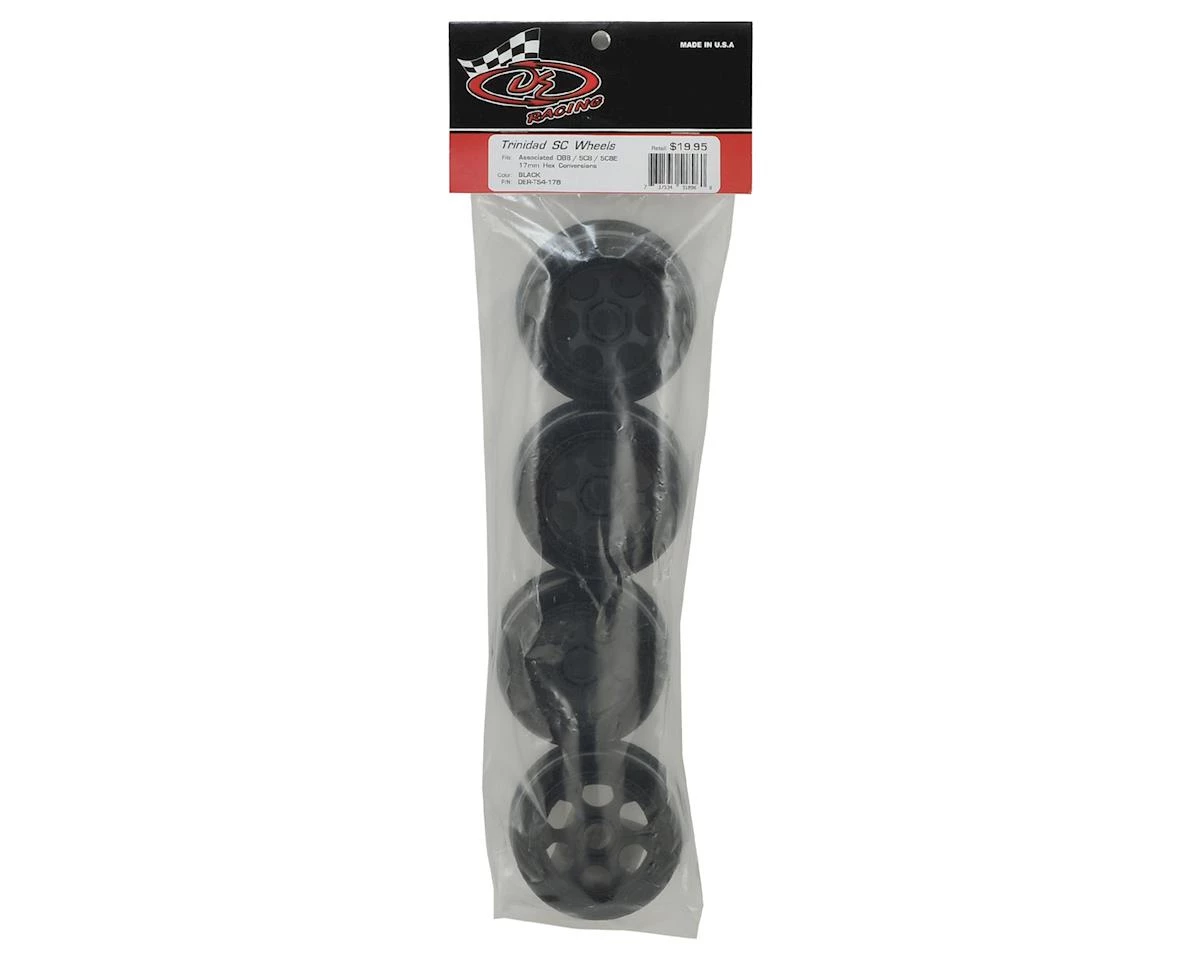 This is a set of four DE Racing Trinidad SC Front/Rear Wheels. These wheels are intended for use with the Associated SC8 trucks and other short course trucks that use 17mm adapters and 0 offset wheels. Built with the same attention to detail that is offered in the rest of the Trinidad SC wheel line, DE Racing is proud to bring you a new kind of SC wheel, the “Trinidad” with 17mm hex. It features the same 17mm hex and offset found on 1/8 scale buggy wheels and is intended for use with the adapters that many drivers have on their SC trucks. Now you can bash or practice with your old 1/8 scale buggy wheels and tires and then switch to race legal wheels and tires without the timely process of having to remove the adapters.