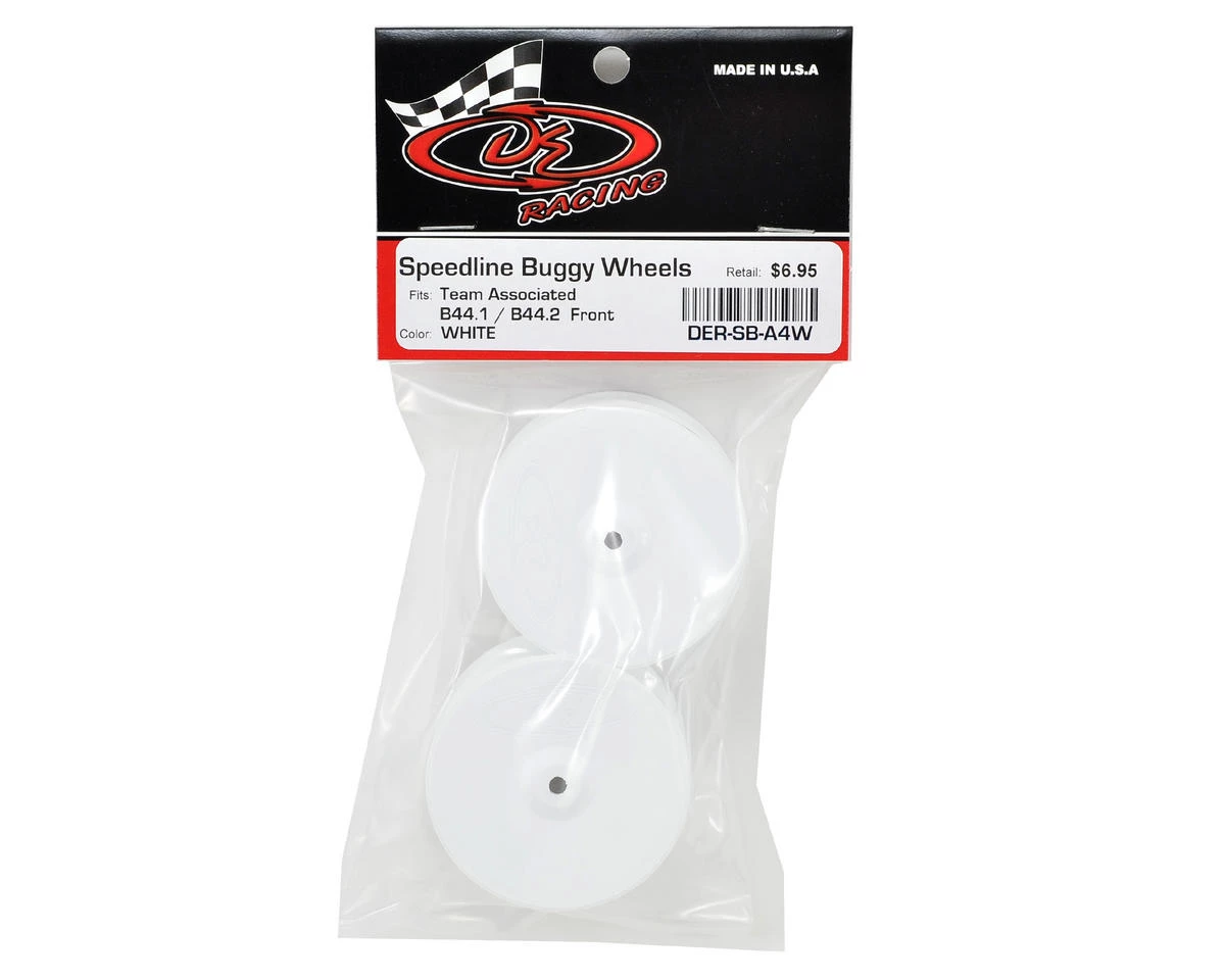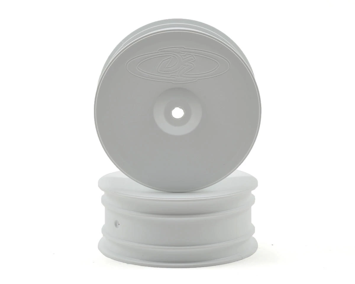 This is a pack of two white DE Racing “Speedline” 2.2 4wd Front Buggy Wheels. Blending a traditional style dish wheel to the precision and durability DE Racing is known for, the Speedline series wheels make a statement to the racing community even larger than the logo on the face. Features include a channel for easier tire gluing, start holes for optional venting, and improved wheel flex to optimize traction and handling.
