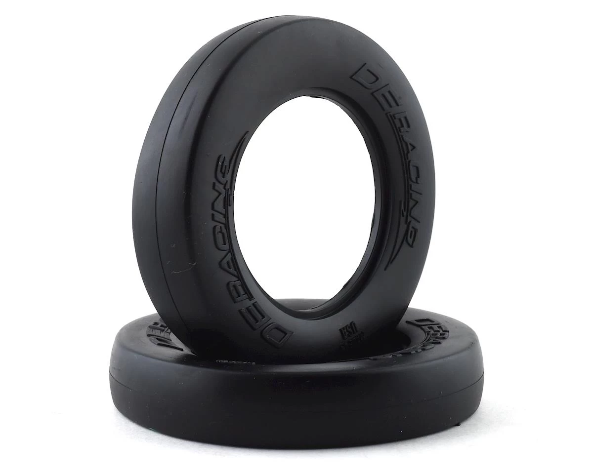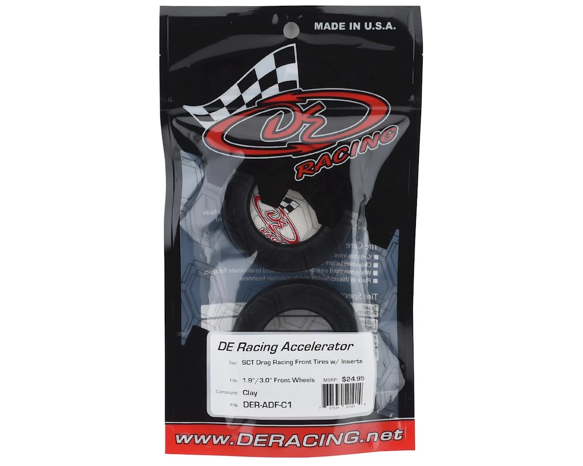 DE Racing Accelerator Drag Racing Front Tires are one component in an innovative front wheel and tire package for RC Drag racing. Designed to push the limits of performance and style for the 132 crew, this tire features a narrow width just like the full size cars they emulate and tip the scales at a mere 35 grams per assembled wheel, tire, and insert set.