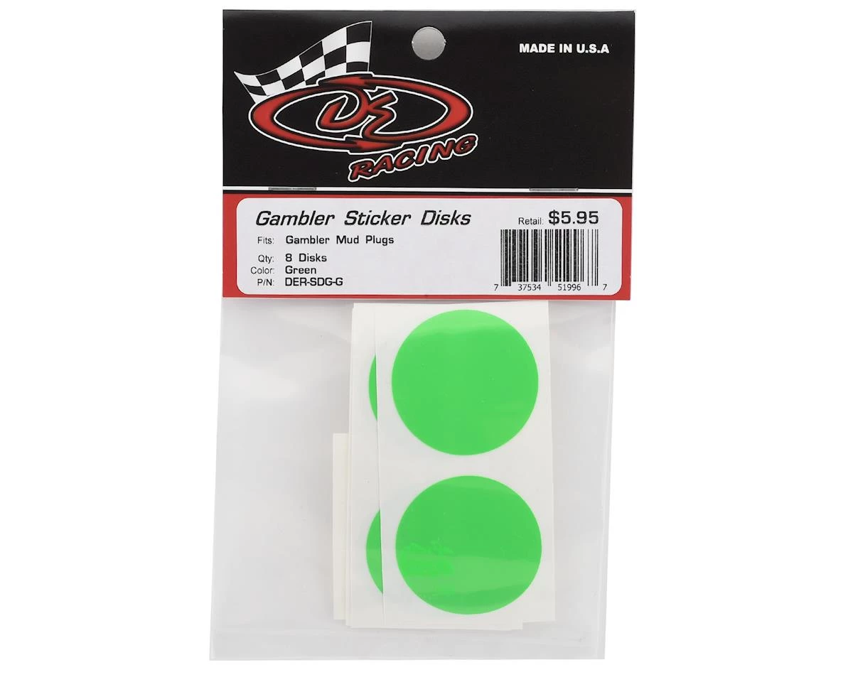 This is an eight pack of optional DE Racing Gambler Dirt Oval Wheel Sticker Disks. These sticker discs are intended to be placed over the DE Racing Wheel Mud Plugs (DER-GMP-BLK).