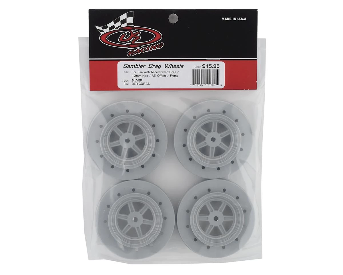 This is a set of DE Racing Silver Gambler Drag Racing Front Wheels are an innovative front wheel design for RC Drag racing. Designed to push the limits of performance and style for the 132 crew this wheel features a narrow width just like the full size cars they emulate and tip the scales at a mere 35 grams per assembled wheel, tire, and insert set.