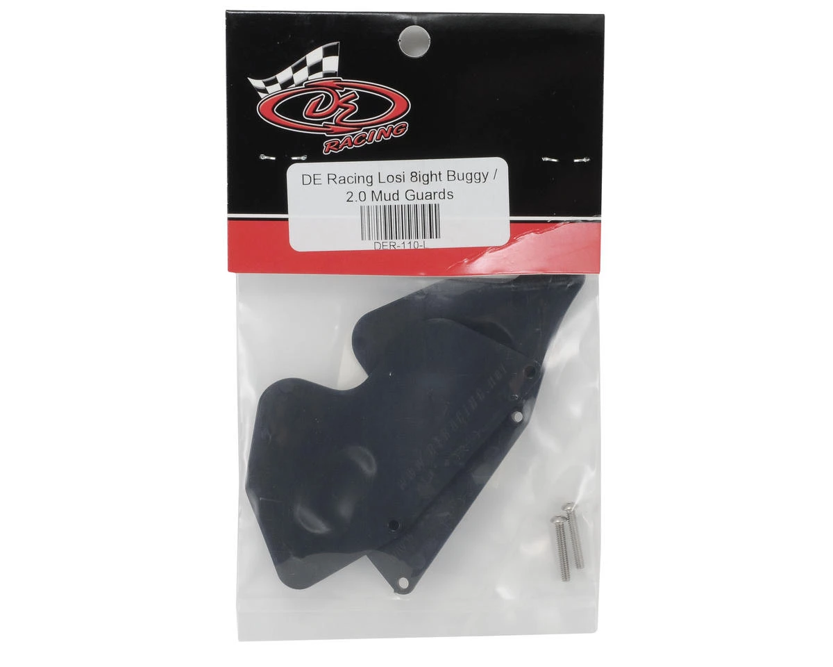 This is a set of optional DE Racing Buggy Mud Guards, and are intended for use with the Losi 8ight and 8ight 2.0 buggies. These mud guards are engineered to be direct installation parts, with no additional body trimming or added holes to the suspension arms required. They install in minutes and will protect the rear suspension and drive train components from damage or contamination from rocks, dirt or mud. Proudly designed and manufactured in the U.S.A. from scuff resistant plastic, these mud guards will withstand much more abuse than a thin lexan, or carbon fiber plate and are the latest must have item for your Losi buggy.Â