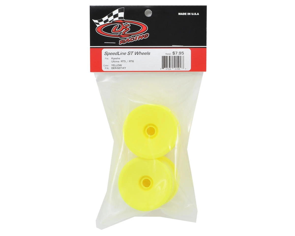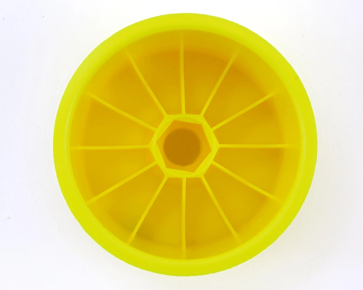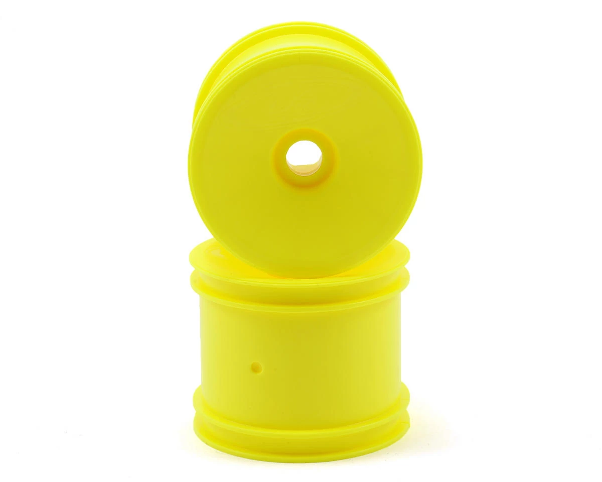 This is a pack of two yellow DE Racing “Speedline” 2.2″ 1/10 Stadium Truck Hex Wheels. Blending a traditional style dish wheel to the precision and durability DE Racing is known for, the Speedline series wheels make a statement to the racing community even larger than the logo on the face. Features include a channel for easier tire gluing, start holes for optional venting, and improved wheel flex to optimize traction and handling.