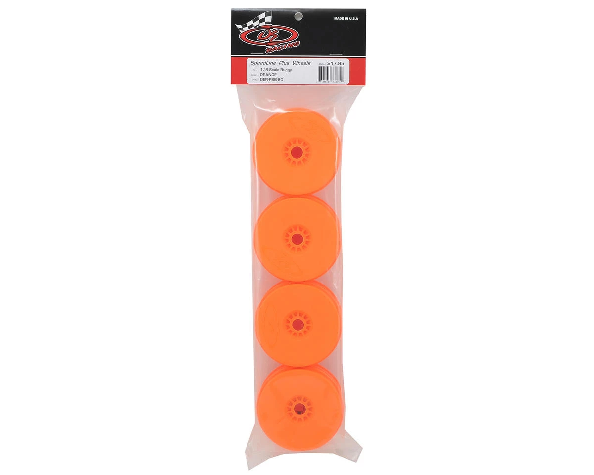 This is a pack of four DE Racing “Speedline PLUS” 1/8 Buggy Wheels. The guys at DE Racing have developed a game changing wheel for 1/8 buggy enthusiasts. The SpeedLine PLUS delivers maximum corner control and stability by utilizing DE’s “Sure Lock” foam retention system. This system features radial ribs that lock the wheel and foam insert together, for maximum tire traction, while eliminating the vague inconsistencies that come from an insert that is free to move around on its wheel. Combine this with the highest level of precision, durability, and a scant 38g race weight and the choice is clear. Don’t settle for second best, get “locked in” with DE Racing SpeedLine PLUS.