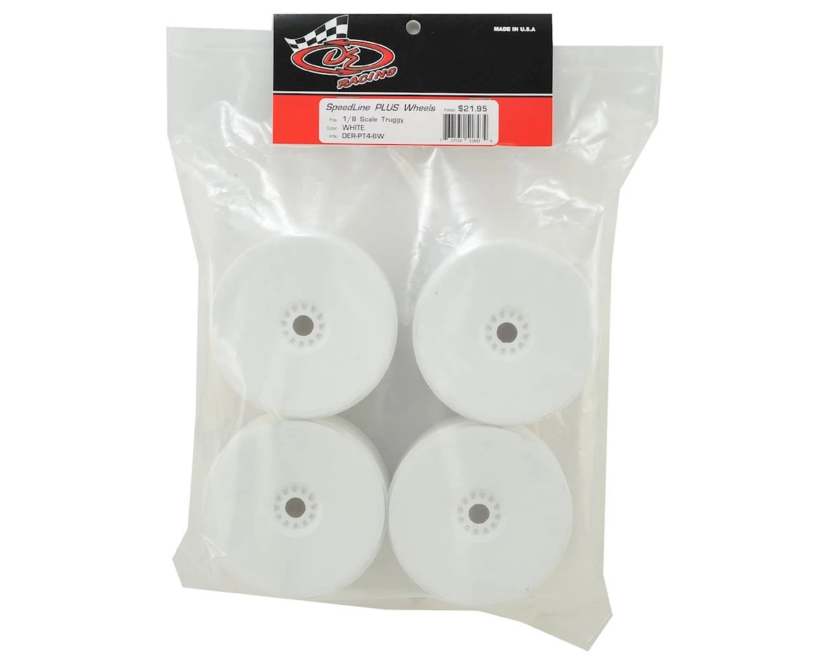 This is a pack of four DE Racing “Speedline PLUS” 1/8 Truggy Wheels. The guys at DE are turning up the heat once again, in a quest to reinvent the wheel. The DE Racing SpeedLine PLUS Truggy wheel is a game changing wheel for demanding truggy racers that delivers maximum corner control and stability by utilizing DE’s “Sure Lock” foam retention system. This system, comprised of radial ribs that lock the wheel and foam insert together, retains maximum tire traction to the racing surface while eliminating the vague inconsistencies that come from an insert that is free to move around on its wheel. Combine this with the highest level of precision, durability, and a scant 58g race weight and the choice is clear. Don’t settle for second best, get “locked in” with DE Racing SpeedLine PLUS.