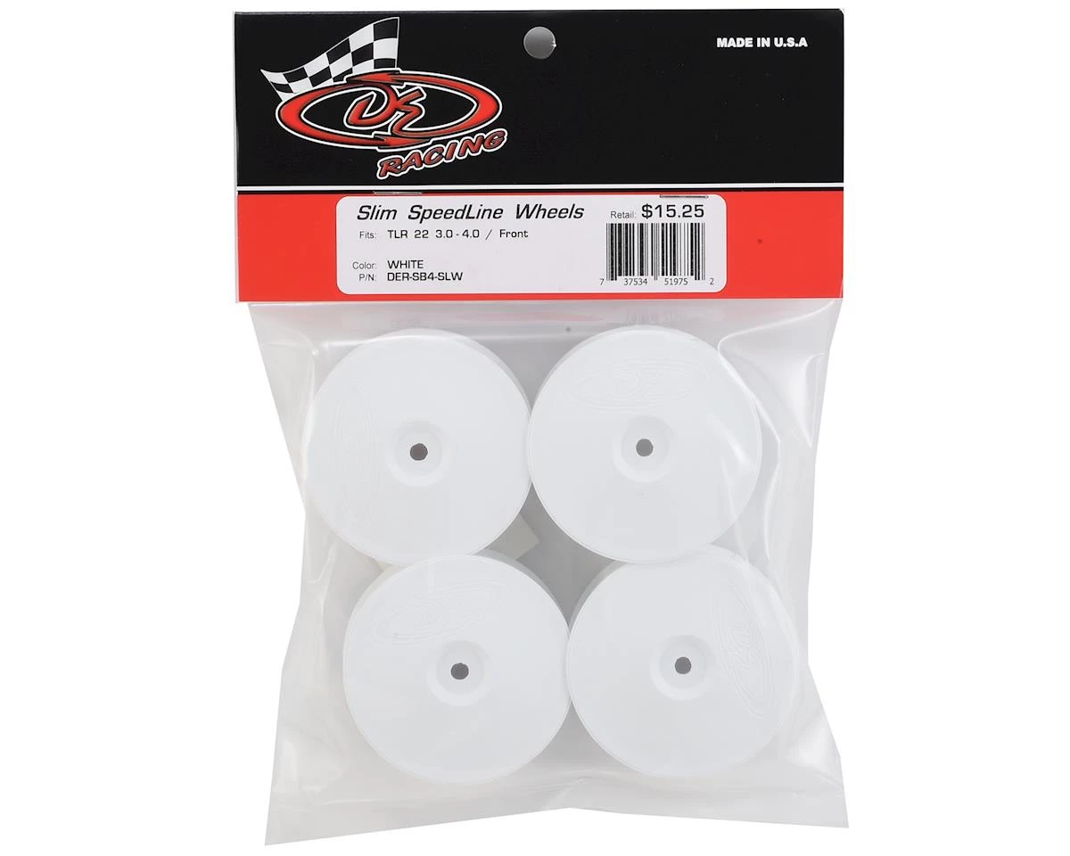 DE Racing Speedline “Slim” 2.2 2WD Front Buggy Wheels for the Losi 22 4.0 blend a traditional style dish wheel to the precision and durability DE Racing is known for. The Speedline series wheels make a statement to the racing community even larger than the logo on the face. Features include a channel for easier tire gluing, start holes for optional venting, and improved wheel flex to optimize traction and handling. Package includes four wheels.
