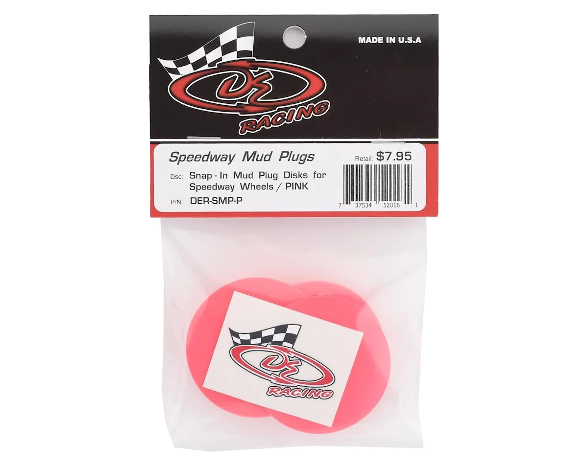 DE Racing Speedway Dirt Oval Mud Plugs are a clever solution to the problem of mud packing into the outer side of a wheel that perfectly emulates those found in full scale racing. These mud plug disks simply snap-in to DE Speedway series wheels to complete a package for total oval racing dominance. These disks not only help with keeping heavy mud out, but their flat surface offers a billboard to display your own personal styling flair with some optional cut or printed vinyl. When the race is over and your trophies have been collected they are easily removed by depressing a tab on the inside of the wheel with just one finger.