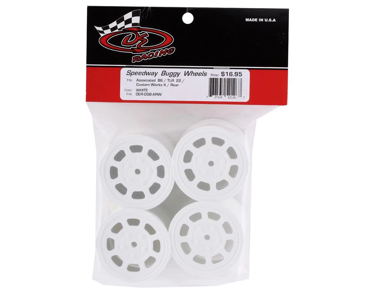 DE Racing Speedway Rear Wheels are a great way to help keep your oval car rubber side down. These wheels offer a classic oval look, are available in black, white, or silver color options, and fit Associated B6, Losi 22 or Custom Works Outlaw 4/Rocket 4 applications. Package includes four wheels.Â