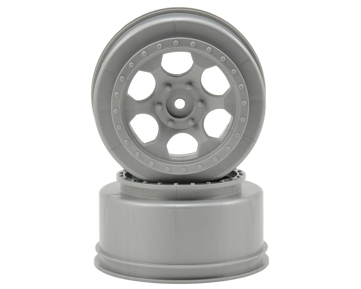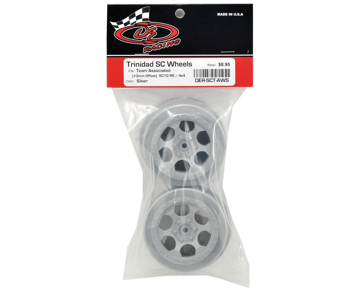 This is a set of two silver DE Racing +3mm Trinidad SC Wheels, and are intended for use with the Team Associated SC10 4×4 short course truck, as well as the SC10 when equipped with a 12mm hex conversion. These wheels feature a +3mm offset per side to make the truck wider and more stable while still maintaining a ROAR legal width for 2wd and 4wd. Named after a rugged valley section of the prestigious Baja 500 and 1000 desert races, DE Racing brings you the “Trinidad” SC wheel. These are some of the most detailed wheels available for your Short Course truck. One look and you’ll agree that these wheels are pure eye candy.
