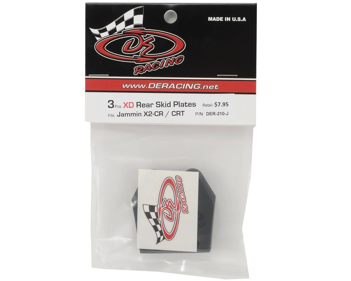 This is a set of three optional DE Racing XD “Extreme Duty” Rear SkidPlates, and are intended for use with the Jammin CR & CRT family of 1/8vehicles. The XD skid plates are the next step in the evolution of theDE Racing Skid Plate. With a re-designed leading edge and stronger screwcountersinks the XD series skid plates are more durable than everbefore! The ultra thin design eliminates the need for longer screws andthe proprietary resin wears like aluminum, but at a fraction of theweight and price!