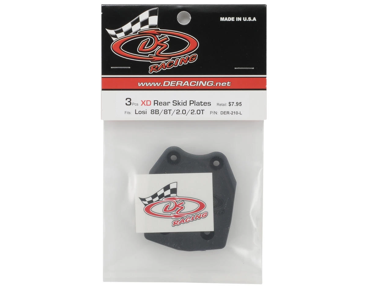 This is a set of three optional DE Racing XD “Extreme Duty” Rear Skid Plates, and are intended for use with the Losi 8ight family of 1/8 vehicles. The XD skid plates are the next step in the evolution of the DE Racing Skid Plate. With a re-designed leading edge and stronger screw countersinks the XD series skid plates are more durable than ever before! The ultra thin design eliminates the need for longer screws and the proprietary resin wears like aluminum, but at a fraction of the weight and price!
