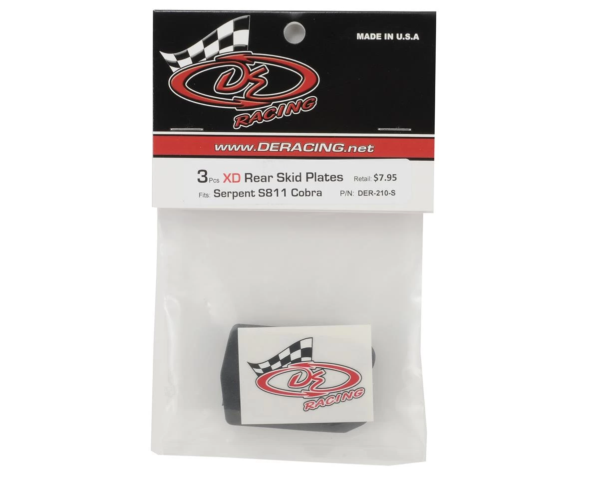 This is a set of three optional DE Racing XD “Extreme Duty” Rear SkidPlates, and are intended for use with the Serpent S811 Cobra1/8 buggy. The XD skid plates are the next step in the evolution of theDE Racing Skid Plate. With a re-designed leading edge and stronger screwcountersinks the XD series skid plates are more durable than everbefore! The ultra thin design eliminates the need for longer screws andthe proprietary resin wears like aluminum, but at a fraction of theweight and price!