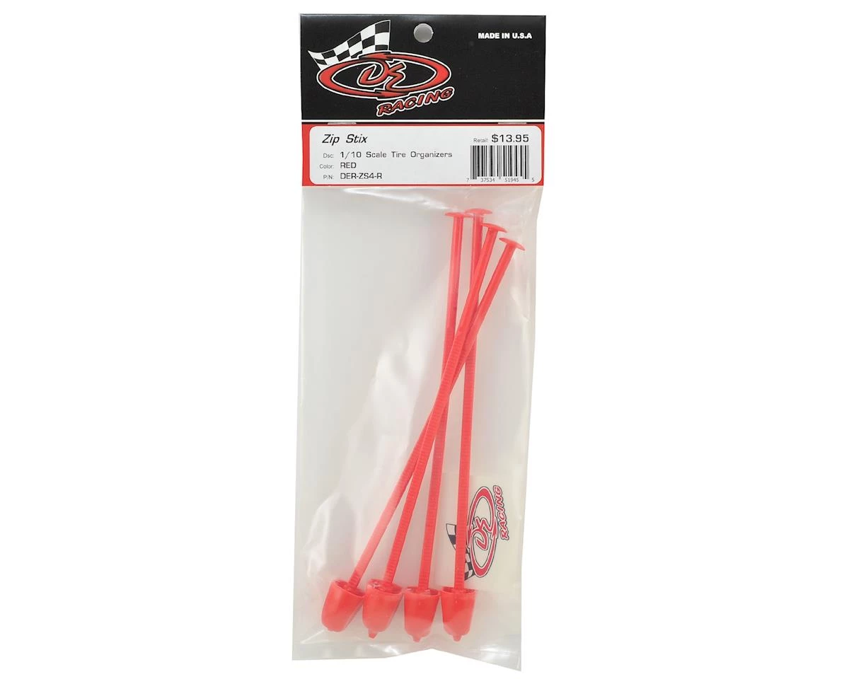 This is a set of four DE Racing Zip Stix Tire Organizers. This quick and simple to use tool allows you to organize and ID your tires by tread and compound. No more fumbling or guesswork regarding tire sets, lost tires, or extra hardware. You’ll wonder how you ever raced without them.
