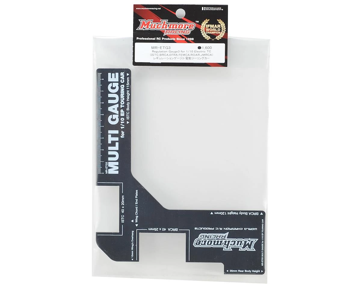 The Muchmore 1/10 Electric TC Regulation Gauge3 allows you to easily check your body, wing size and wing positions, to verify that your setup is in compliance with the rules dictated by major sanctioning bodies. This includes ISTC, BRCA, EFRA, FEMCA, ROAR and JMRCA.