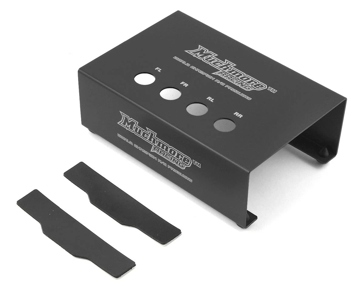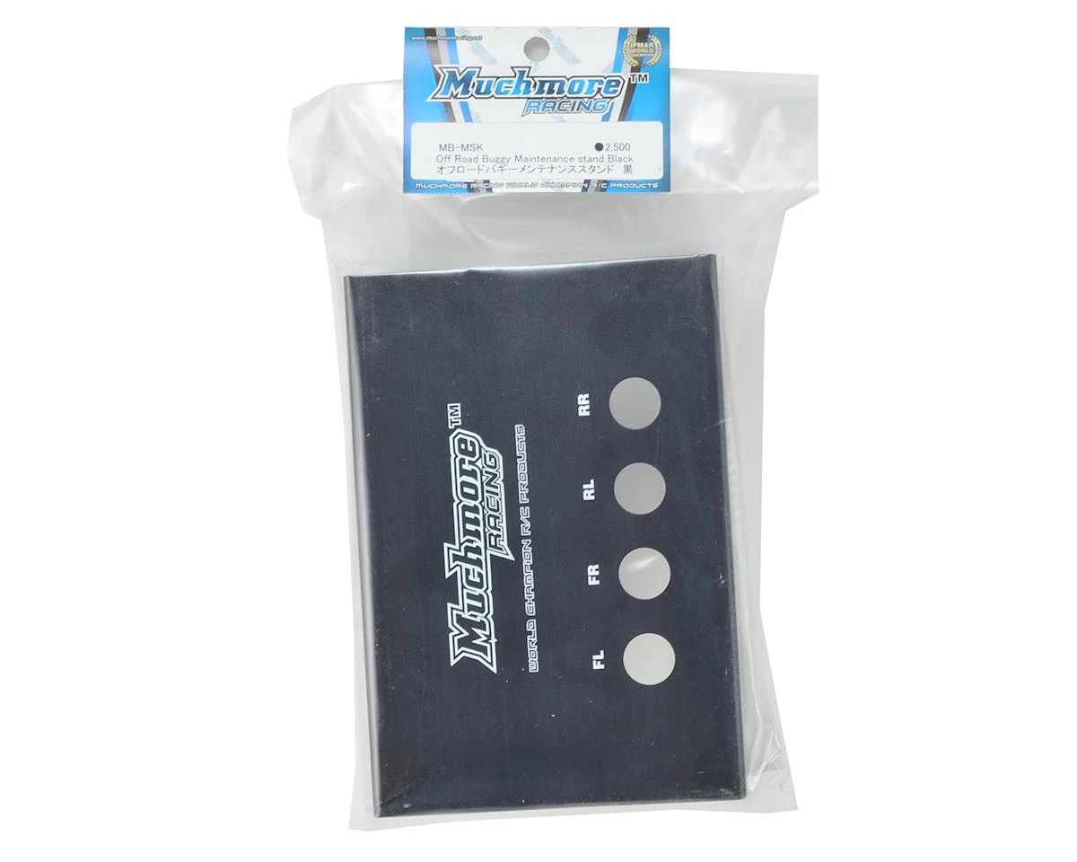 The Muchmore Racing 1/10 Off Road Buggy Maintenance Stand measures 160x105x60mm and features four 15mm holes in the top that can be used to hold your shock bodies during maintenance. Two adhesive foam pads are included that you attach to the stand to help prevent your car from sliding around on the stand.