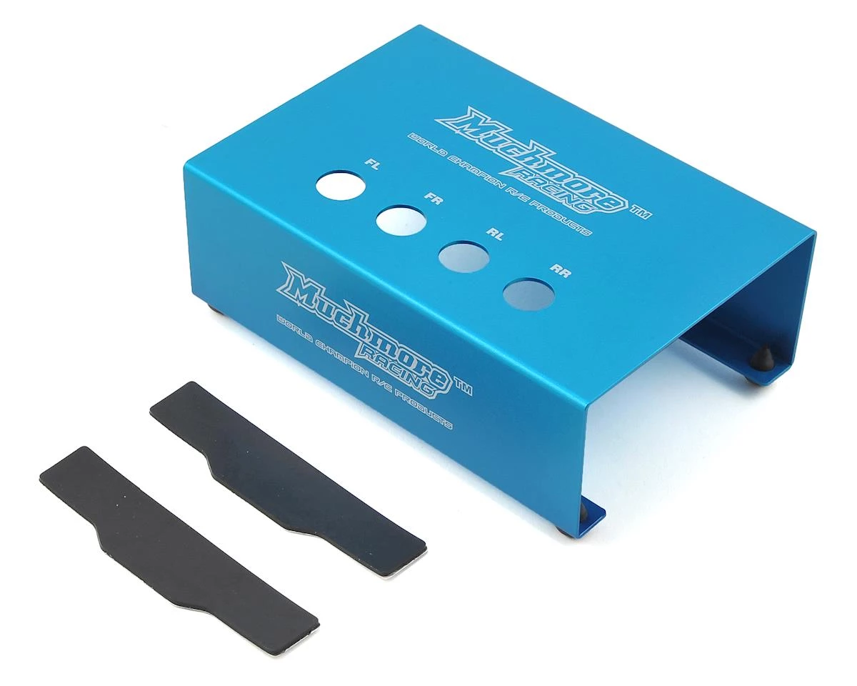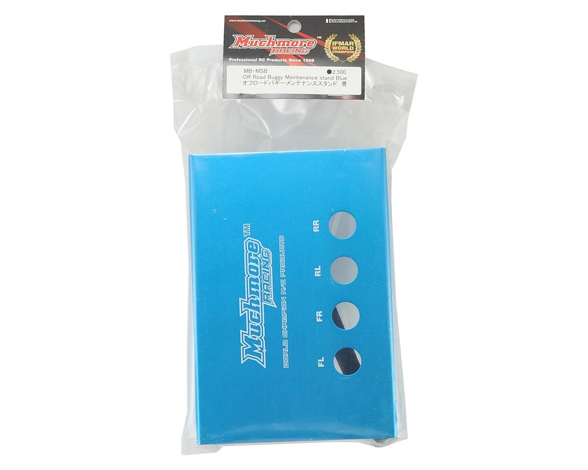 The Muchmore Racing 1/10 Off Road Buggy Maintenance Stand measures 160x105x60mm and features four 15mm holes in the top that can be used to hold your shock bodies during maintenance. Two adhesive foam pads are included that you attach to the stand to help prevent your car from sliding around on the stand.