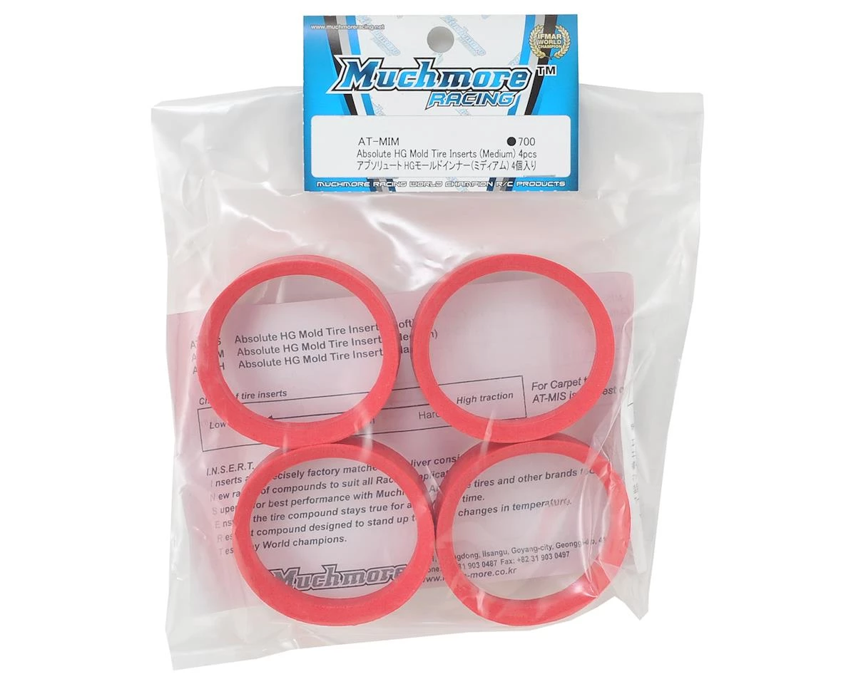 Muchmore Racing Absolute HG Molded Tire Inserts are precisely factory matched to deliver consistency on the track and have been molded from a compound designed to stand up to severe changes in temperature so the tire compound stays consistent for a very long time. The range of compounds available (Yellow/Red/Blue) will suit all Racing applications. The inserts fit Muchmore Absolute tires perfectly and will fit other brands too.