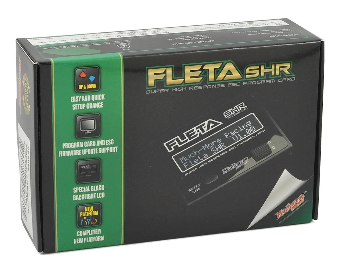 The Muchmore FLETA SHR Super High Response Program Card is a must have for any FLETA ESC owner. Featuring a quick setting scroll wheel for easy one hand operation and a back lit LCD display, this programmer will make it easy to tune your ESC. Plus, the programmer is also a USB adapter link so you can connect your ESC to a PC and update firmare or adjust parameters on the ESC through the PC.