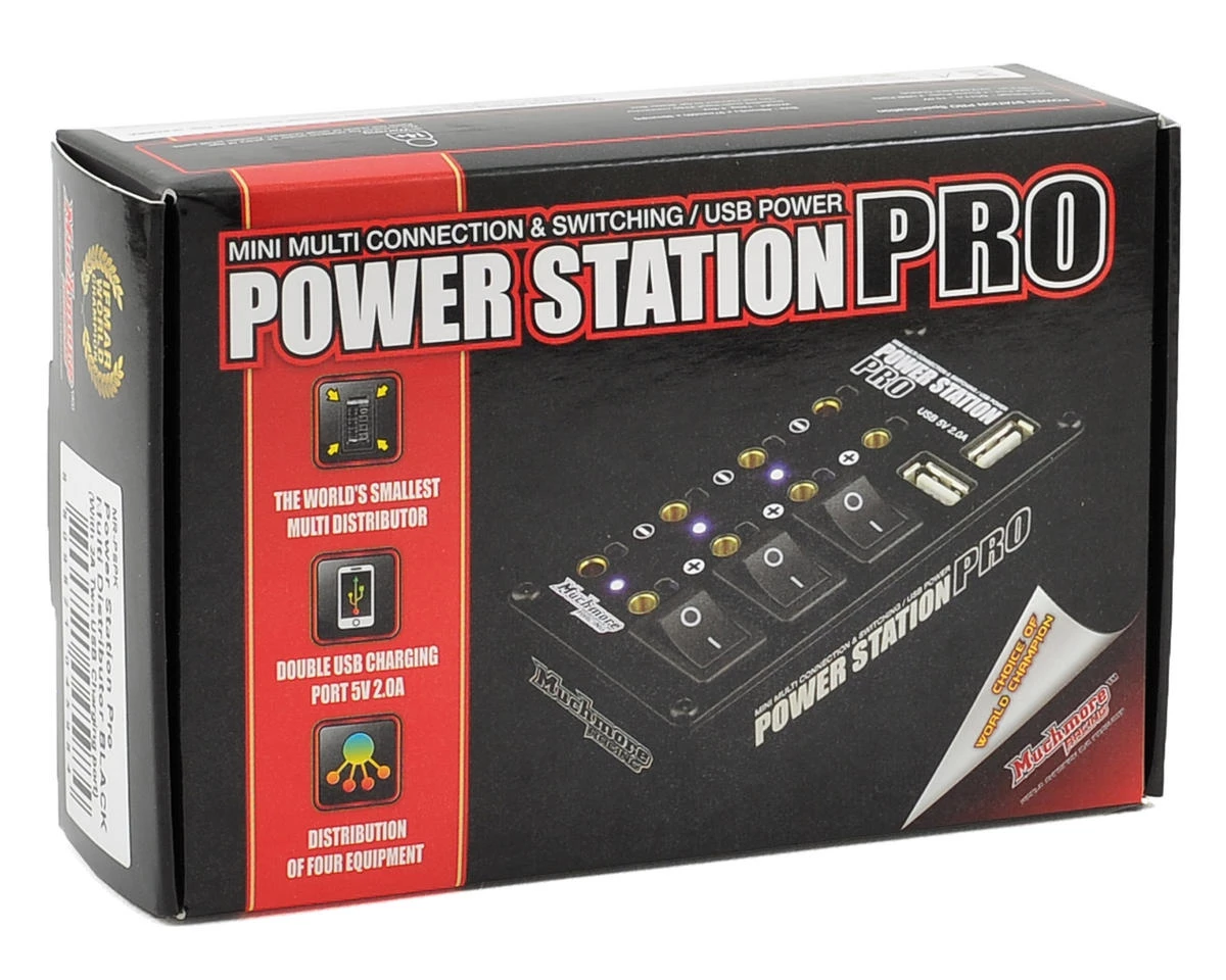 This is the Muchmore Power Station Pro Multi-Distributor Box. One of the world’s smallest multi-port distributors, the Power Station Pro features four output ports and two 5V 2A USB ports that support Smart phones and other devices.