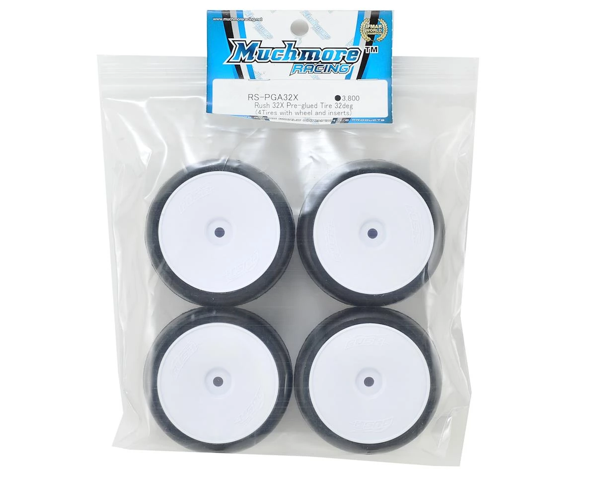 Muchmore Racing Rush Pre-Glued Touring Car Tires are precision mounted with high quality inserts on Muchmore Rush wheels. These are a great choice for handout tires for spec racing, as well as for general race use. Choose from 32 or 36 shore rubber compounds. Â